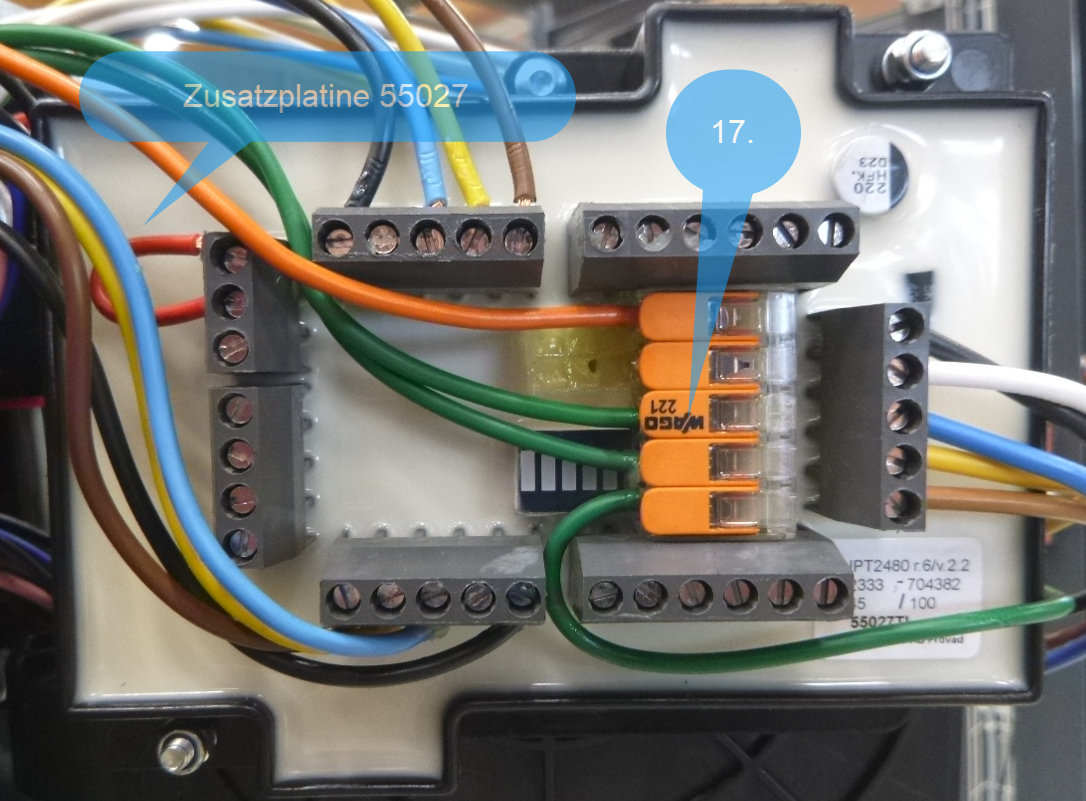 14. Monte la platine "55027" à l'arrière de la carte de relais TLC-B1 . Utilise la vis, l'écrou, la rondelle et la douille filetée du convertisseur AD démonté précédemment. 15. Retirer tous les fils de la carte de relais TLC-B1 qui vont sur les bornes de Ctrl 1, 2 et 3. 16. Relie les fils de la connexion "platine TLC-B1" aux connexions libres sur "Ctrl 1" (sur la platine de relais TLC-B1). 17. Place le connecteur 5 pour "2H" selon la figure. 18. Montez le fil vert sur "2H" près de "Ctrl 1". 19. Montez l'extrémité libre du fil orange (déjà relié au "connecteur à 9 pôles") sur le "connecteur à 5 pôles" (voir aussi point 17).