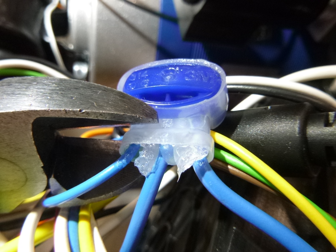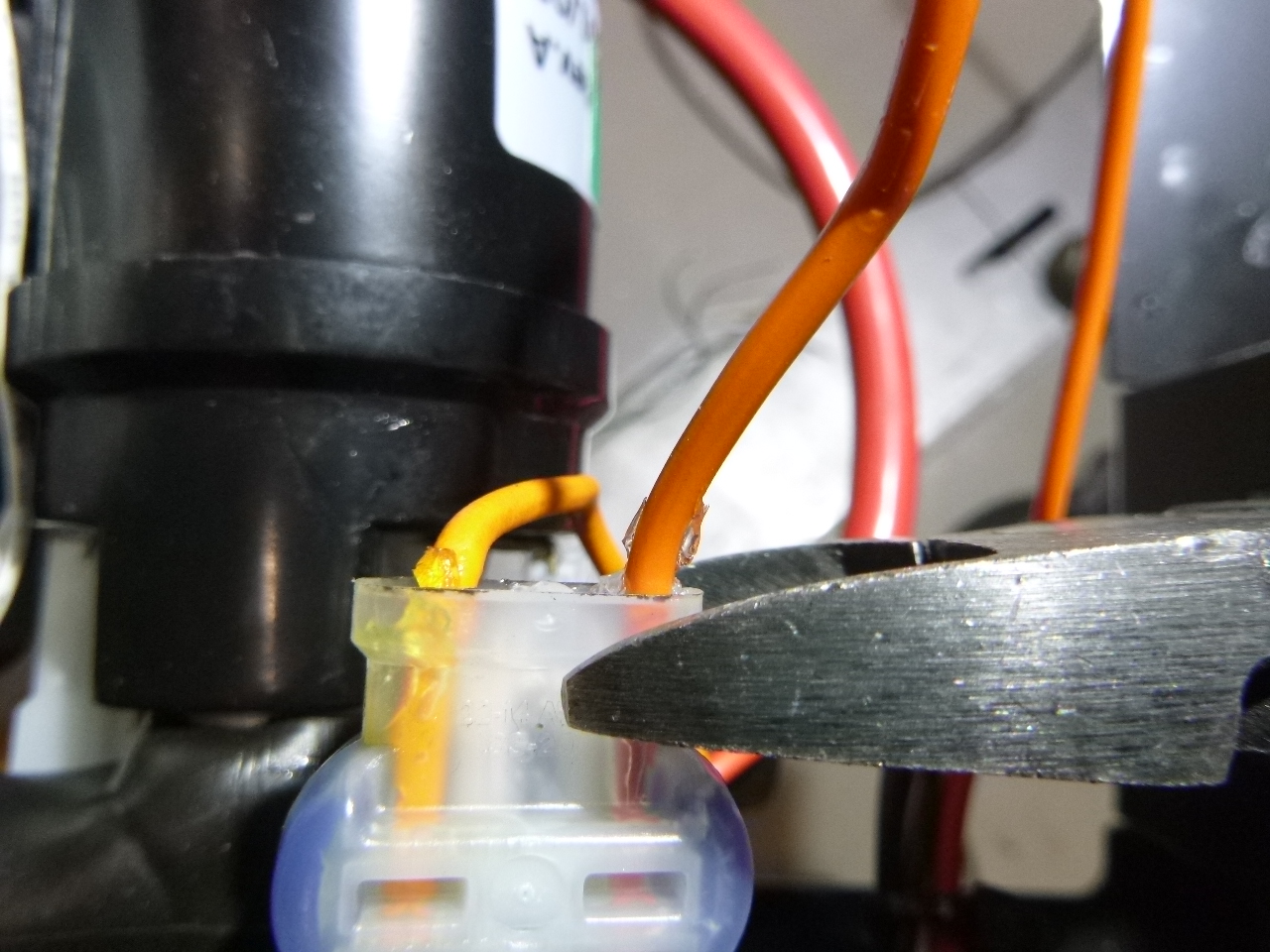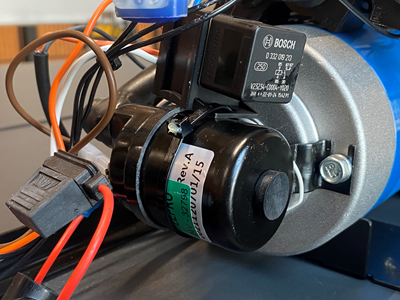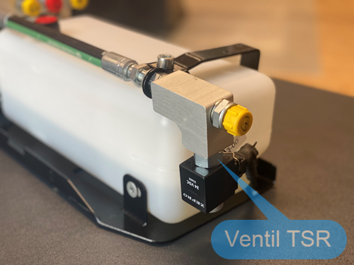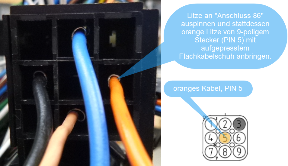 28. Débrancher le connecteur de la bobine de la vanne "TSR". 29. Coupe le câble orange entre le connecteur bleu 2 et "PIN 5" du connecteur à 9 pôles. 30. Retire le fil noir (vers le connecteur "TSR") du "raccord négatif" rond près du moteur et enlève le câble. 31. Fixe le relais (voir kit de relais 79324TL) au contacteur du moteur à l 'aide d'un serre-câble , fais passer le câble vers la vanne "TSR" et branche-le. 32. Connecte les deux fils noirs (venant du relais et du câble de la vanne "TSR") à laborne "moins" du moteur. 33. Coupe le fil noir (environ au milieu) qui passe entre le connecteur à 9 pôles (PIN 3) et la bobine de la vanne "V3". 34. Relie les deux extrémités libres du fil noir coupé à la borne Wago 3 fournie dans le kit de transformation. 35. Relie le fil bleu détaché, venant du relais "connexion 30", à la borne Wago 3 fournie. 36. Presse l'extrémité libre du fil orange (venant de la "PIN 5" du connecteur à 9 pôles) sur la cosse plate jointe. 37. Sur le socle du relais, retire le fil orange au niveau de la "borne 86" et insère à la place le fil avec la cosse de câble préalablement pressée. 38. Réunis le connecteur à 9 pôles dans le groupe hydraulique.