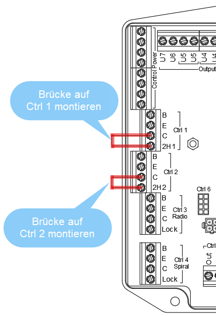 ▪Toujours raccorder la commande extérieure droite à Ctrl 1. ▪Raccorder la commande extérieure gauche à Ctrl 2, sauf si la borne est déjà occupée par la télécommande radio. ▪Toujours brancher la télécommande radio sur la touche 2. ▪Brancher la télécommande au pied sur la touche 3. ▪Raccorder la commande intérieure à la commande 4 ou directement à la commande extérieure. |